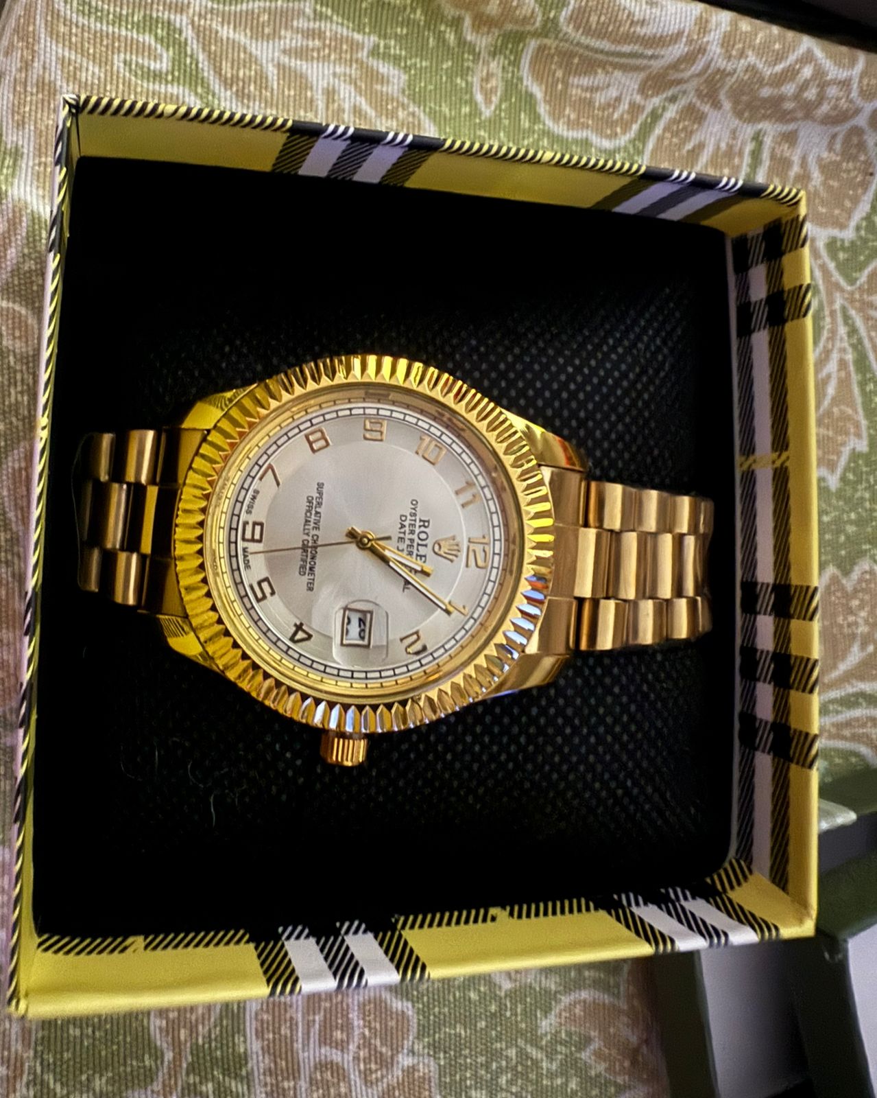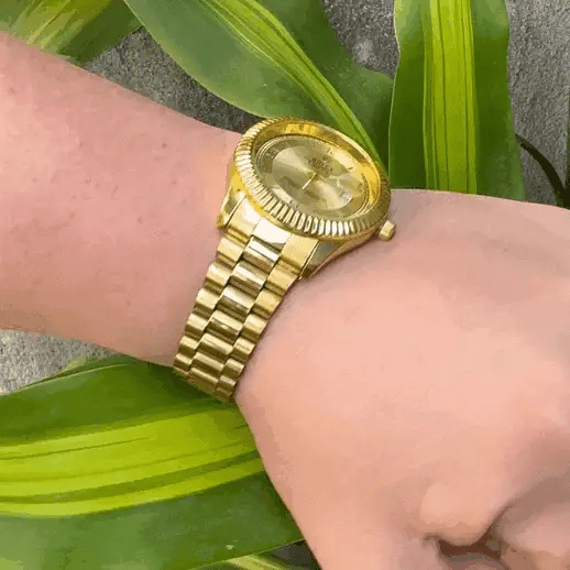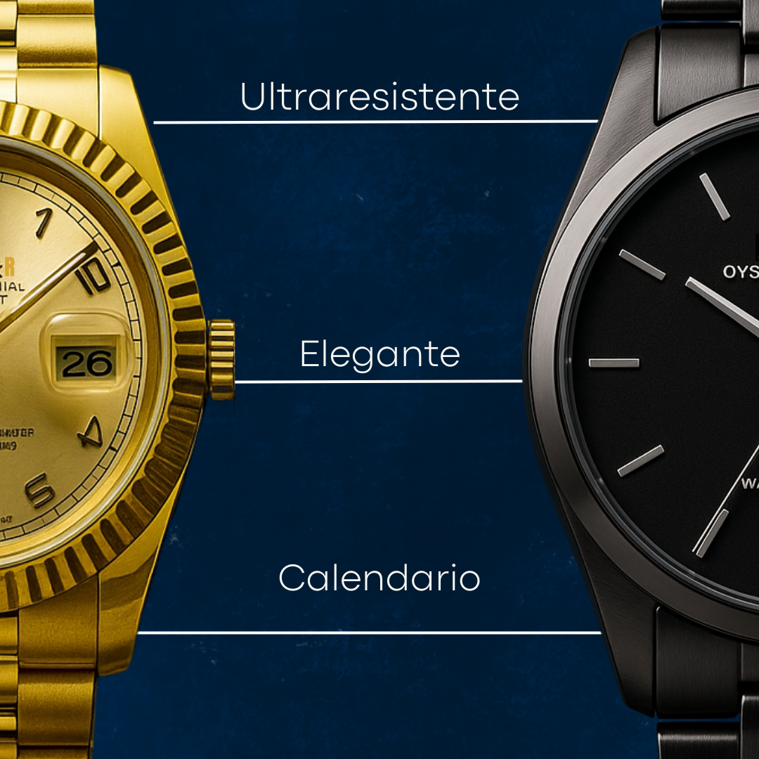 Elefante Vintage Gold (dorado): caja de acero 316L con recubrimiento PVD oro de 38–40 mm y grosor cercano a 12 mm; bisel liso pulido; cristal de zafiro con lente para la fecha. Movimiento automático (21,600–28,800 vph) con reserva aproximada de 40–70 h; horas, minutos, segundos, fecha rápida y hackeo de segundero; regulación típica –10/+20 s/día. Hermeticidad de 100 m con corona atornillada y doble sellado. Esfera champán con acabado rayos de sol, índices aplicados y luminiscencia en agujas. Brazalete de acero PVD oro con eslabón macizo (estilo 3 o 5 hileras) y cierre desplegable con microajuste ~5 mm. Entre asas 20 mm; peso aproximado 145–165 g.