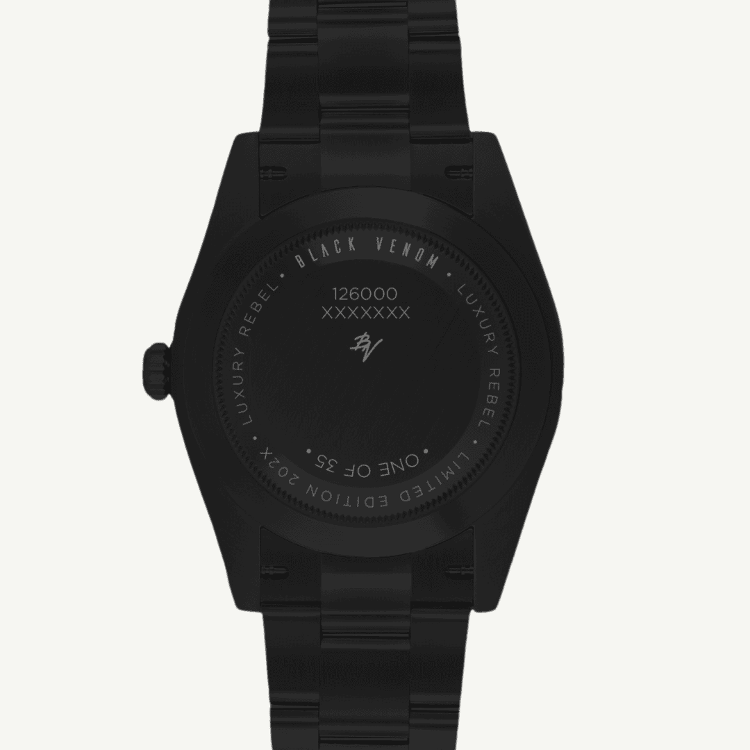 Black Venom (negro mate): caja y correa de resina reforzada de alta resistencia, diámetro 50–52 mm y grosor 15–17 mm; cristal mineral endurecido. Movimiento de cuarzo (digital o ana-digi) con precisión ±15 s/mes; autonomía de pila 3–5 años o carga solar con indicador. Resistencia a golpes y al agua hasta 200 m, con botones protegidos. Funciones: hora mundial, cronómetro 1/100 s, temporizador, 5 alarmas, calendario automático, formato 12/24 h y luz LED. Extras según versión: sincronización por Bluetooth, alarma vibratoria y sensores (brújula, altímetro, barómetro, termómetro). Peso aproximado 60–75 g.